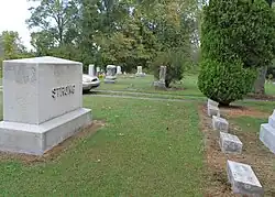 Strong family gravesite. John Strong's headstone is at the end of the row directly underneath an evergreen tree.