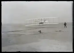 John Thomas Daniels Jr. (July 31, 1873 โ January 31, 1948) was a member of the U.S. Life-Saving Station in Kill Devil Hills, North Carolina, who took the photograph of the first powered flight on December 17, 1903.[1] The flight was by the Wright brothers flying their Wright Flyer. Daniels, who had never seen a camera before, later said that he was so excited by seeing the Flyer rising that he was unsure if he had squeezed the bulb triggering the shutter.[2] The camera that he operated was a Gundlach Korona V view camera, which used 5-by-7-inch glass-plate negatives. The camera was owned by the Wright brothers, who were careful to record the history-making moment, and also to preserve a record for any future patent claims. The plate was not developed until the Wright Brothers returned to Ohio.[3]