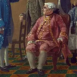 In 1765, he was a larger seated figure included in a caricature[5] painting by Thomas Patch.[4][6] Patch was another Englishman living abroad and he had left Rome for Florence after he had been banished for a scandal based on his homosexuality.[7]