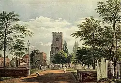 John Varley was born at the Old Blue Post Tavern, Hackney, on 17 August 1778. His father, Richard Varley, born at Epworth in Lincolnshire, had settled in London after the death of his first wife in Yorkshire. His mother was an alleged descendant of the regicide Oliver Cromwell through the marriage of his daughter, Bridget, and the Parliamentarian soldier and politician General Charles Fleetwood. Varley's parents discouraged his leanings towards art, and placed him under a silversmith.[1] But on their death he was for a brief time employed by a portrait painter in Holborn and then, at the age of 15 or 16, he became a pupil of Joseph Charles Barrow (fl. 1789–1802) who had an evening drawing school twice a week at 12 Furnival's Inn Court, Holborn. It was Barrow who took Varley on a sketching tour to Peterborough from which he emerged as a professional painter. In 1798 he exhibited a highly regarded sketch of Peterborough Cathedral at the Royal Academy and became a regular exhibitor at the RA until the foundation of the Old Watercolour Society in 1805.[1]