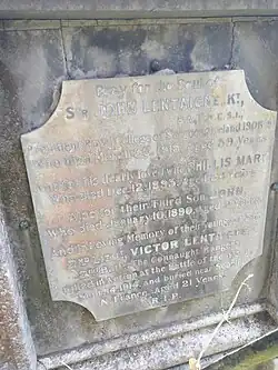 He married Phyllis Mary Coffey in February 1882, and they had 2 daughters and 3 sons.[2] Lentaigne died at his home in Dublin on 30 March 1915.[3][4]