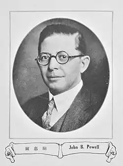 Interrupting his journalism studies at the University of Missouri, Powell rejoined his father at the China Weekly Review. After the Japanese Attack on Pearl Harbor, Powell joined the American Office of War Information, the military's journalism program, as a news editor. In 1943, Powell was sent to Chongqing, China, a city in far southwestern China (and the wartime capital of Free China), where he remained for the rest of the war. For eight years after World War II, from 1945 until June, 1953, Powell published his journal, first as the "China Weekly Review" and later on, when its revenues declined greatly, as the "China Monthly Review".[2] While in China, Powell was an advocate for Chinese sovereignty and was a supporter of Chinese president Cao Kun.[3]