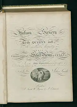 Other books illustrated with engravings after works by Smith include Select Views in Italy (1792–6); Views of the Lakes of Cumberland, with twenty aquatints by James Merigot (1791–5); William Byrne's Britannia Depicta and William Sotheby's Tour through Wales (1794).[2] This last book was subtitled "Odes and other Poems. With Engravings from Drawings taken on the Spot by J. Smith". In the preface, Sotheby wrote "the author of the following Poems thinks proper to signify, that the present edition is published solely for the emolument of the artist, who has stamped a value on the descriptive parts of the Welsh Tour, by the embellishments of his accurate and masterly pencil". The plates were etched in aquatint by Samuel Alken.[7]