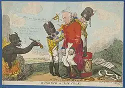 A cartoon showing Whitelocke's demotion after the court martial. Two child drummers strip him of his military garb and break his sword as a devil offers him a weapon to commit suicide.Ben Hughes, The British Invasion of the River Plate 1806-1807: How the Redcoats Were Humbled and a Nation Was Born (2014).