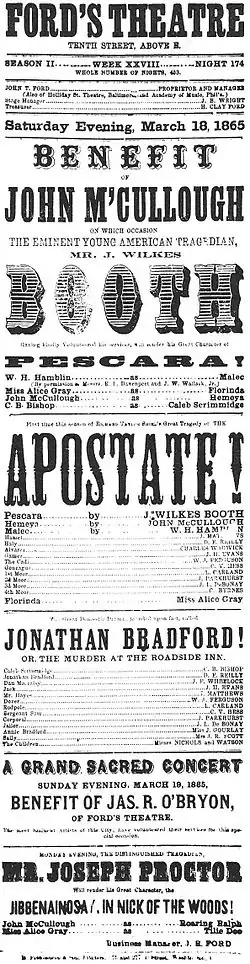March 18, 1865, Ford's Theatre playbill—Booth's last acting appearance