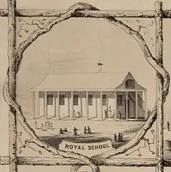 Kīnaʻu entered the Chiefs' Children's School (later renamed the Royal School) on February 26, 1844, at the age of two as its sixteenth and last pupil.[13] He was the youngest with Victoria Kamāmalu and Lydia Kamakaʻeha, both being four years older. He was chosen by Kamehameha III to be eligible for the throne of the Kingdom of Hawaii. He was taught in English by American missionaries Amos Starr Cooke and his wife, Juliette Montague Cooke, alongside his royal cousins. During their Sunday procession to church it was customary for boys and girls to walk side by side, Kīnaʻu would walk beside Lydia Kamakaʻeha, the future Queen Liliʻuokalani of Hawaii. In Liliʻuokalani's memoir, he is mentioned as John Kīnaʻu Pitt.[14] The boarding school discontinued in 1850, and his family sent him to the day school (also called Royal School) ran by Reverend Edward G. Beckwith along with his former classmates Victoria Kamāmalu and Lydia Kamakaʻeha and new classmates Gideon Laʻanui, Nancy Sumner, Jane and Martha Swinton, and Mary Waterhouse.[15][16][17] During his youth, the prince was often found on the parade ground of the old Honolulu Fort, instructing his friends while they were drilling as boy scouts.[18] Kīnaʻu was considered to be a promising young man with an extremely bright mind and leadership qualities.[9][10]