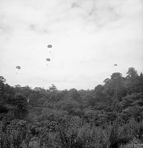 In September 1963 the British embassy in Jakarta was stormed by angry Sukarno-supporting crowds, badly damaging the embassy.[94] In an atmosphere of rising tension, the Indonesian government sent regular and elite soldiers (some of whom had been trained by US Special Forces) to fight alongside the border gangs in Borneo.[95][96][17] General Walker asked Woodhouse to send a third SAS squadron.[97][17] Woodhouse, already stretched with troops in Yemen, got permission to re-form 'B' Squadron, asking Major John Watts (who had led the SAS assault on the Jebel Akhdar) to train and lead the new (re-formed) squadron.[98][99] During training in the UK, reports were received from Borneo of increasing Indonesian aggression and SAS actions in which men had been killed. 'D' Squadron arrived home exhausted. Watts took his new recruits to Brunei for final jungle training in October 1964, then in November started operations as part of the highly classified Operation Claret.[100]