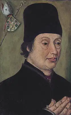 John of Burgundy (1404 – 27 April 1479), also known as Jean de Bourgogne, was the illegitimate son of John the Fearless, through his mistress Agnes de Croy, daughter of Jean I de Croÿ and was appointed Archbishop of Trier, served as Bishop of Cambrai from 1439 to 1479, Provost of St. Donatian's Cathedral and St. Peter's Cathedral at Lille.[1] He was the great-grandson of King John II of France.[2][3][4]