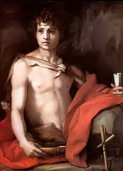 The story of John the Baptist is told in the Gospels. John was the cousin of Jesus, and his calling was to prepare the way for the coming of the Messiah. He lived in the wilderness of Judea between Jerusalem and the Dead Sea, "his raiment of camel's hair, and a leather girdle about his loins; and his meat was locusts and wild honey." He baptised Jesus in the Jordan, and was eventually killed by Herod Antipas when he called upon the king to reform his evil ways. John was frequently shown in Christian art, identifiable by his bowl, reed cross, camel's skin and lamb. The most popular scene prior to the Counter-Reformation was of John's baptism of Jesus, or else the infant Baptist together with the infant Jesus and Mary his mother, frequently supplemented by the Baptist's own mother St Elizabeth. John alone in the desert was less popular, but not unknown. For the young Caravaggio, John was invariably a boy or youth alone in the wilderness. This image was based on the statement in the Gospel of Luke that "the child grew and was strengthened in spirit, and was in the deserts until the day of his manifestation to Israel." These works allowed a religious treatment of the partly clothed youths he liked to paint at this period.[1]