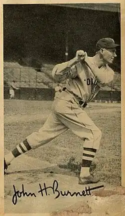 John Henderson Burnett (November 1, 1904 – August 12, 1959) was an American professional baseball player who appeared primarily as a shortstop, third baseman and second baseman in Major League Baseball (MLB) from 1927 to 1935 for the Cleveland Indians and St. Louis Browns.[3] Burnett holds the record for most hits in a single game in MLB history with nine.[4]