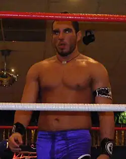 Gargano appeared on the very first episode of Pro Wrestling Ohio (PWO), a promotion owned by his uncle, on Sports Time Ohio on November 20, 2007.[10] He would lose his debut, in what many called an upset, to Gregory Iron, a wrestler with a disability known as cerebral palsy.[23] Iron issued several challenges to Gargano, claiming he could beat him in another match. Meanwhile, Gargano remained in denial of the original defeat from Iron, and continued to mock Iron's disability, his history of concussions, and rough upbringing.[23] At the February 2008 PWO TV tapings, Gargano brutally attacked Iron, busting him open, assaulting him with a chair, and bashing his head into the ringside barricades.[23] On August 1, 2008, Gargano defeated Iron in a Last Man Standing match in front of over 1,000 fans in Cleveland, Ohio to end their feud.[23]