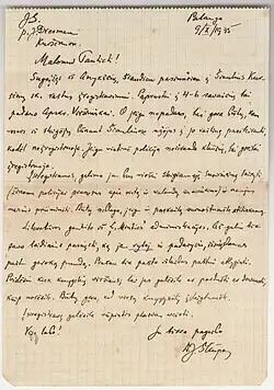 Šliūpas visited Kaunas where he learned that Pyotr Shchebalsky, editor of the Russian edition of Dziennik Warszawski, raised the issue of the Lithuanian press in Congress Poland which included Lithuanian-inhabited Suvalkija. Šliūpas wrote a memorandum asking to lift the press ban and discussed it with several other Aušra collaborators in Marijampolė. Šliūpas was the only one who dared to sign it and bring it to Iosif Gurko, the Governor-General of Warsaw.[41] The memorandum listed all the ways that the Russian Empire would benefit from lifting of the ban – lessening of the Polish influence and mistrust of the Russian government among Lithuanian peasants as well as the gained ability to control and censor legal press (the illegal press included many anti-government articles). The memorandum and by extension Šliūpas were later criticized for its sharp anti-Polish rhetoric.[42] Šliūpas delivered the memorandum to a deputy of Gurko and, to avoid the police, quickly left to Mitau (Jelgava).[43] There he got engaged to Liudmila Malinauskaitė, an orphaned daughter of a large landowner who Šliūpas met as a gymnasium student in Mitau.[10][44] He felt being followed and spied on and tried to sail from Libau (Liepāja) to Germany, but the police found a missing stamp in his passport. Šliūpas then fled to Palanga and was smuggled by two fishermen in their boat to East Prussia.[45] He traveled to Hamburg and on 28 May 1884 sailed to New York.[46]
