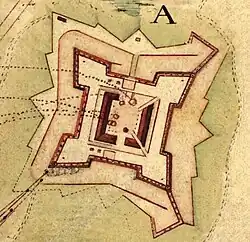 Jonas Moore, probably grandson of Sir Jonas Moore the mathematician, received his commission as probationer engineer in October 1709. On 1 January 1711 he was appointed sub-engineer at Gibraltar and attached to David Colyear, 1st Earl of Portmore, the governor, for special service. According to Vetch, he was later sent to Port Mahon, Minorca, where he remained for some years, only returning to Gibraltar in August 1720.[1] However, Paul Latcham thinks this is a mistake probably resulting from confusion with one James Moore, who was engineer on Minorca from around 1715.[2]