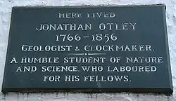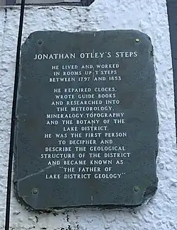 Otley died in Keswick on 7 December 1856 and was buried in Crosthwaite Churchyard.[18] A simple slate plaque acts as a memorial on the flight of stone steps, Jonathan's Steps, in King’s Head Court, close by Keswick's Moot Hall.