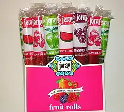Joray Fruit Rolls are an apricot-based fruit snack produced by Joseph Shalhoub & Son, Inc, founded 1886 by George Shalhoub after immigrating from Lebanon. Joray Fruit Rolls were developed by Louis Shalhoub in the 1970s and have been produced in New York City since then. The fruit roll is a derivative of the Levantine confection, amardeen, a thick paste made from dried apricots.[1] Made from real fruit, these fruit leather products are fat-free and kosher.[2]
