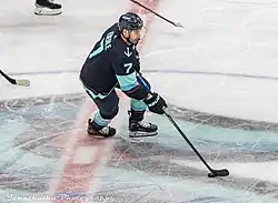 After being left unprotected by the Islanders, Eberle was selected by the Seattle Kraken at the 2021 NHL expansion draft on July 21, 2021.[190] Leading up to their inaugural 2021–22 season, Mark Giordano was named the inaugural captain of the Kraken on October 11, and Eberle, Jaden Schwartz, Adam Larsson, and Yanni Gourde were named alternate captains.[191] Eberle was quickly assigned to be a top line winger alongside Schwartz and Jared McCann.[192] Eberle began the season on a goalless streak before scoring the first hat trick in franchise history on November 4, 2021, to lift the Kraken over the Buffalo Sabres. He subsequently became the ninth NHL player to score a natural hat trick for an expansion team in its inaugural season.[193] Following the hat-trick, Eberle continued to produce as he led the Kraken with six goals through 12 games.[194] Within the next three games, he added two goals to lead the Kraken with eight goals and 12 points in 15 games.[195] During the Kraken's seven-game point streak in November, Eberle scored 10 points before the Kraken then lost six straight games.[196] Eberle later missed two games to recover from an injury but returned for the Kraken's 6–1 loss to the Pittsburgh Penguins on December 6.[197] Despite missing numerous games, Eberle continued to lead the team in scoring with 12 goals while Jaden Schwartz led with 13 assists.[198] While Yanni Gourde and Riley Sheahan were in the NHL's COVID protocol, McCann joined Schwartz and Eberle as part of the Kraken's top six forward lines.[199] However, Schwartz was replaced with Marcus Johansson in January after he suffered a hand injury.[200] With his new linemate, Eberle continued to lead the team with 23 points while also recording the second best goal scoring rate of his career.[201] He also blocked 20 shots through 33 games, on pace to surpass his career high set during the 2013–14 season. Eberle's efforts were recognized league-wide with a selection for the 2022 National Hockey League All-Star Game.[202] On February 5, Eberle become the first Kraken to score in an NHL All-Star Game although the Pacific Division would fall 6–4 to the Metro Division. He also participated in the NHL Fountain Faceoff competition where he fired pucks into five targets floating in the Fountains of Bellagio.[203] Upon returning from the All-Star Game, Eberle's offensive talent decreased and he finished the season with nine goals over the final 56 games.[204] Although he hit the 20-goal milestone for the sixth time in his career,[205][2] the Kraken failed to qualify for the 2022 Stanley Cup playoffs.[206]