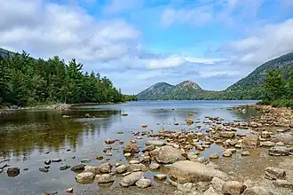 Jordan Pond is an oligotrophic tarn in Acadia National Park near the town of Bar Harbor, Maine. The pond covers 187 acres (76 ha) to a maximum depth of 150 feet (46 m) with a shoreline of 3.6 miles (5.8 km).[4][3][5]