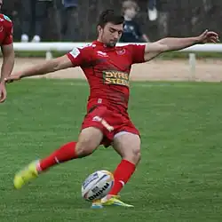 After being awarded with a development contract for the 2012–13 season, Williams made his first league start for the Scarlets as a full-back away to Connacht on 15 September 2012, scoring two tries and a conversion on the way to a 24–11 victory and the man of the match award.[10] After missing the team's next game against the Ospreys, he returned to the side for a 22–20 defeat away to Benetton Treviso; Williams was at fault for Treviso's third try of the game, as his kick was charged down and run in by Robert Barbieri.[11] That was his last appearance for the Scarlets for almost a year. Things got worse for Williams in October 2012, when he suffered a dislocated shoulder while playing for Llanelli in a 38–28 victory over Gala RFC in the British and Irish Cup, which kept him out for four months.[1] After his recovery, he returned to the fly-half position for all eight of Llanelli's remaining Premiership games for which he was available, including the 47–15 loss to Pontypridd in the play-off final.[12]