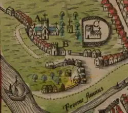 John Speed's 1610 map showing the former chapel of St. Jordan between Bristol Cathedral (A) and St. Mark's Church (C).[24][25]