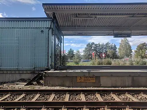 Jordbro is a station on Stockholm's commuter rail network, located in the urban area of Jordbro within Haninge Municipality. It is situated on the Nynäs Line, 28.8 km from Stockholm Central Station. The station has a single island platform with entrances at both ends. As of 2015, approximately 3,700 passengers boarded trains at Jordbro each weekday.[2] Several SL bus lines also serve the station.