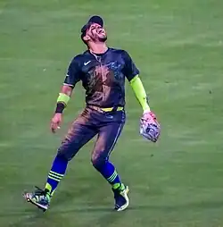 On April 15, 2023, Caballero was selected to the 40-man roster and promoted to the major leagues for the first time.[7] He made his MLB debut that night as a defensive substitution, replacing J. P. Crawford at shortstop in the ninth inning against the Colorado Rockies.[8] On April 19, 2023, he recorded his first hit, a stand-up double off Eric Lauer of the Milwaukee Brewers.[9] Caballero began seeing more playing time at second base as veteran Kolten Wong struggled.[10] On May 21, 2023, he hit his first major league home run off Nick Anderson of the Atlanta Braves, in the process becoming only the second Mariner after Mike Cameron to record a homer and three stolen bases in the same game.[11]