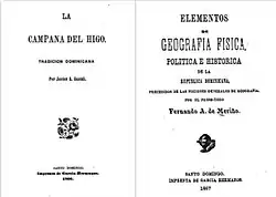 The first Dominican novel printed in the Dominican Republic was "La Campana del Higo: Tradición Dominicana" by Francisco Angulo Guridi and published by García Hermanos in 1866.[36] Other famous publications of the era like "Lira de Quisqueya" (1874) collected by José Castellanos, "Fantasías indígenas" (1877) by José Joaquín Pérez,[37] "Adela" by Francisco Javiar Amiama (1872), "Los dos restos de Cristóbal Colón" (1879) by Emiliano Tejera, "Poesías" by Salomé Ureña (1880), "Enriquillo" by Manuel de Jesús Galván (1882), "La Hija del Hebreo" by Federico Henríquez y Carvajal (1883), "Las vírgenes de Galindo" by Félix María del Monte (1885), "Poesías" de Josefa Perdomo Heredia Archived 2017-05-11 at the Wayback Machine (1885), "Apuntes para la Historia de los Trinitarios" by José María Serra (1887), "Moral Social" by Eugenio María de Hostos (1888) and "Madre Culpable" by Amelia Francasci (1893) were also printed and published by the García Hermanos.