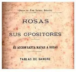 José Rivera Indarte (1814 in Córdoba – 1845 in Santa Catarina) was an Argentine poet and journalist. He was at times both a supporter and critic of Juan Manuel de Rosas, writing first the "Anthem of the Restorers" and later the "Blood tables".