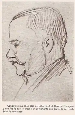 León Toral was born in Matehuala, San Luis Potosí, into a family of Catholic miners.[6] He moved to Mexico City during the Mexican Revolution and witnessed General Obregón closing churches and arresting priests who were suspected of supporting ex-President Victoriano Huerta. In 1920, he joined the National League for the Defense of Religious Freedom, which opposed the governments of Obregón (1920–1924) and Plutarco Elías Calles, and he reportedly was also involved in the Cristero War.[7][8][9]