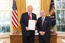 On July 24, 2017, Romualdez was finally nominated by the President to be the Philippines' Ambassador Extraordinary and Plenipotentiary to the United States of America.[19][20] He was confirmed by the Commission on Appointments on August 23, 2017, and took his oath on August 29.[21][22] He presented his credentials to United States President Donald Trump on November 29.[23] He is the third member of the Romualdez family to occupy the post after his uncles Eduardo Romualdez and Benjamin Romualdez.[8][24]
