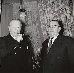 Hilmar Jørgensen (with pipe) and his brother August Nilsen Jørgensen in 1960 at August's 70th birthday