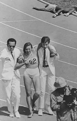 ![]() Josefa Vicent aided at the end of the 400-metre race in the 1968 Summer Olympics (an exhausted Olajumoke Bodunrin in the background) | |
