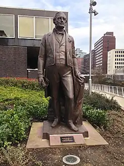 A Joseph Brotherton Memorial Fund was established, and a statue of Brotherton was erected in Peel Park in 1858.[2] The statue was dismantled in 1954 and sold into private ownership in 1969. At the time Salford City Council were looking for any additional revenue and it sold the statue to a scrap metal merchant. He was aware of the rivalry between the two cities so he approached Manchester with the suggestion they might buy it. It was purchased by Manchester City Council in 1986, and was resited at Riverside Walk, overlooking the River Irwell and facing towards Salford. The effect was that he was looking balefully at the city that thought so little of him as to sell his statue. It was relocated onto the Salford bank of the Irwell to make way for a new footbridge linking Salford to the Spinningfield development.[7][8] In May 2018 it was returned to Peel Park and placed on a plinth which was a replica of the original one it occupied. The statue was listed in December 2023.[9]