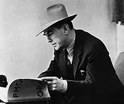 In 1919, he was appointed as head of the art department at First National Pictures in New York.[35] With the firm's publicity department in mid-June 1920, and having fitted out an automobile painted with graphics advertising the company's movies on the sides, he and Matthew Singer set off on a tour for a greater part of the year, traveling across the United States from Broadway and 42nd Street to the Truckee woodlands, California, promoting, in a semi-official capacity, the firm's sub-franchising plan.[36]