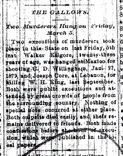 On January 21, 1879, Joseph murdered George E. King (c1826 – 1879) near Drynob, Laclede County, Missouri. He was tried and found guilty in Lebanon, Missouri. He was sentenced to death by hanging on August 21, 1879. A public execution has held on March 5, 1880. Joseph Core was the first legal hanging in Laclede County, Missouri.[4]