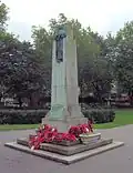 War memorial | Gardens of the Church of St John-at-Hackney, Hackney, London | 1921 | Obelisk-mounted statue | Bronze and Portland stone | 4.6m tall | Grade II | Q26671054 | [8][9] |