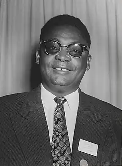In 1957 the Belgian colonial administration instituted reforms that permitted municipal elections and the formation of political parties.[8] The following year Kasongo's friend, Patrice Lumumba, created the Mouvement National Congolais (MNC), a nationalist organisation, and tasked him and several others to form a central committee.[9] On 15 May 1959 Kasongo was elected president of the Orientale Province's chapter of the MNC. Proving himself to be an effective propagandist, he successfully expanded the MNC's influence throughout the region.[3] Together with other party officers, he oversaw the establishment of branches in Stanleyville's communes, neighboring towns, and some locales in Kivu Province.[10] In October he participated in a nationalist congress in Stanleyville.[11] In December Kasongo was elected communal councilor of Mangobo, 776 votes to his opponent's 146.[3] The civil unrest that had surfaced during the year caused the Belgian government to arrange a round table conference in Brussels to discuss the political future of the Congo. Kasongo was invited to attend as a delegate for the MNC but threatened to boycott the conference unless Lumumba, who had been arrested and imprisoned, was allowed to go as well. The Belgian government eventually gave in and both attended the conference.[12] Kasongo served on the conference's bureau.[13] The Belgians and Congolese reached an agreement whereby the Congo would be granted independence on 30 June 1960. General elections for a newly-constituted Parliament took place in May.[14]