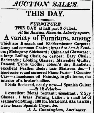 Joseph Lewis Cunningham (1784–1843) or J. L. Cunningham worked as an auctioneer in Boston, Massachusetts, in the first half of the 19th century.[1] Among the many lots he sold were birds, horses, real estate, furniture, sea captains' charts, telescopes, American and European artworks, fishing line, feathers, fabric, guns, musical instruments, fruit trees, flower seeds, printers' equipment, and books.