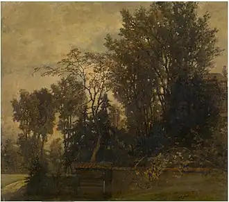 Landscape became more important as the principal subject or background of his paintings and took gradually on a more realistic aspect. The landscapes in his compositions made after 1858 show in the distance villages, roads and fields, which bring to mind the later works of Leys.[4] Lies included a view of an entire village in his The enemy approaches (1857, Royal Museum of Fine Arts Antwerp). He excelled in the rendering of the play of colour and light in his views of forests and fields. His landscapes had an influence on the work of Jean Pierre François Lamorinière who was seven years his junior.[8]