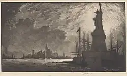 He made further trips to the Americas, including to San Francisco in March 1912, where he undertook a series of "municipal subjects" which were exhibited December 1912 at "the prestigious gallery of Vickery, Atkins & Torrey".[17] It is quite possible that Pennell's visit inspired San Francisco printmakers Robert Harshe and Pedro Lemos, along with sculptor Ralph Stackpole and painter Gottardo Piazzoni, to found the California Society of Etchers in 1912, now the California Society of Printmakers.[18]