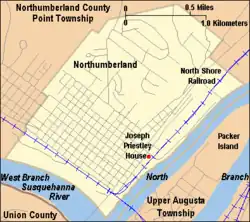 Following the French and Indian War (1755–63) and the forced migration of Native American tribes westward, German, Scots-Irish, and other European immigrants settled in the central Susquehanna Valley, including in the area that would become Northumberland, Pennsylvania.[1] Northumberland was laid out around a central village green in 1772, on land originally purchased from the Iroquois by the Province of Pennsylvania in 1768, as part of the first Treaty of Fort Stanwix.[2]