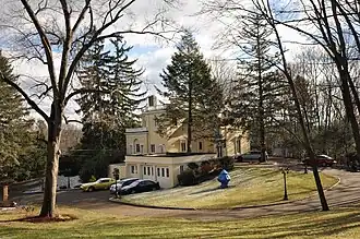 The Joseph Remick House is a historic house in Winchester, Massachusetts. The two story stucco-clad house was built in 1909 by Joseph Remick, and is sometimes called the "Baby Sanborn House" for its resemblance to the much larger Sanborn House just down the road. The house has a central five-bay section, which is flanked by wings that are one story in front and two in back. The main section is five bays wide, with French windows on both floors. The center three on the first floor are topped by triangular pediments, while those on the second floor have keystones set just below a Greek key frieze. A balustrade rings the flat roof.[2]