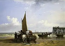 Between 1820 and 1829, Stannard exhibited works at the Royal Academy and the British Institution in London, showing eight works at the British Institution from 1824 to 1828 (Breydon, looking towards Yarmouth; Mundesley Cliffs, looking towards Cromer; A View near Norwich; Breydon—Morning; On the Norwich River; A Marine View; Gorleston Pier—Pilot Boats Going Off and Fresh Breeze, Lowestoft Roads).[42] He was influenced by the work of earlier Dutch artists, whose works he studied and copied during a visit to Holland in 1821 that was perhaps inspired by a similar visit by his future wife and her father in 1820.[19][23]
