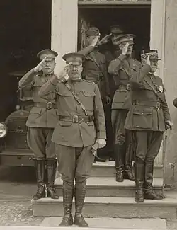 Dickman was then given command of the 3rd Infantry Division in November 1917.[2] He deployed the 3rd Division to France aboard the Leviathan at noon, on March 4, 1918. He was the 3rd Division commander at Chateau-Thierry in May 1918 and was made famous at the Second Battle of the Marne in July 1918. While allied forces on both flanks retreated, the 3rd Division stood fast in the face of enemy offensives, which led to their moniker, "The Rock of the Marne."[2]