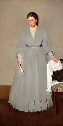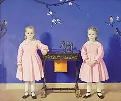 Pearson painted a trio of full-length portraits of his wife Emily, including Study in Gray (1905).[4] He painted a full-length portrait of his eldest daughter Ruth as a child,[9] and at least two double portraits of his twin daughters, Virginia and Jane.[4] The 1917 double portrait depicted the girls in identical pink dresses, flanking a sewing table and standing before a deep blue mural. The Twins: Virginia and Jane received multiple awards, and has become Pearson's most famous work.[10]