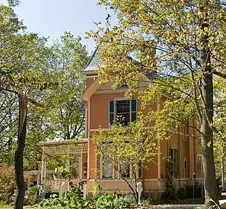 Built of weatherboarded walls with imbricated shingles, the house rests on a stone foundation; its roof is slate, while elements of wood and iron are also present. Two and a half stories tall, the house includes a three-story tower placed above a porch.[2] The tower is covered with a pyramid-shaped roof, based on a cornice with dentils and topped with a delicate iron finial, while the roofs for the rest of the house are typical gables. Its overall floor plan is that of the letter "L"; the porch and tower are placed within the angle formed by the two ells. These elements combine to make it one of Wyoming's best Italianate houses.[3]