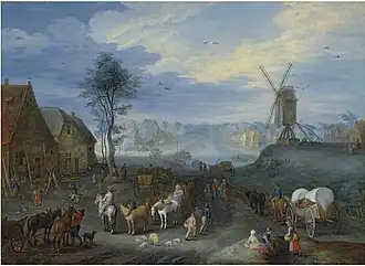He executed his successful compositions in many, almost identical versions as is shown by the two versions of a Village with a windmill, one of which sold by Christie's on 4 July 2012 in London, lot 148 and the other of which was sold by De Jonckheere Master paintings.[8]