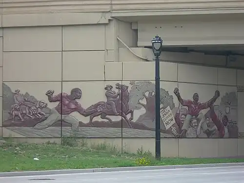 Mural of Glover, on the I-43 overpass in Milwaukee, showing his escape from prison and slavery. The artist is Ras Ammar Nsoroma from Milwaukee Wisconsin who created and painted 3D mural on overpass.