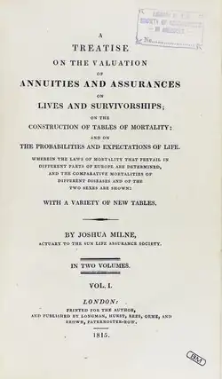 Milne also contributed to the Encyclopædia Britannica, fourth edition, articles on "Annuities", "Bills of Mortality", and "Law of Mortality".[2][6]
