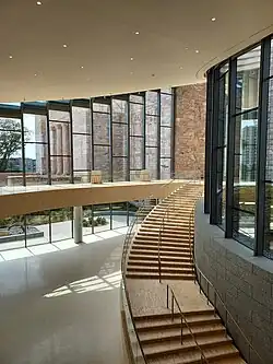 Even though there was still no expansion of the memorial building, in 1987 the Joslyn Memorial participated in a land exchange with Omaha Central High School.[6] Through this exchange the Joslyn acquired land to the east of the memorial building to add a sculpture garden and expand parking, while the high school gained land to the northeast where a new football stadium was constructed.[6]In 1994, the first addition to the Joslyn Art Museum was finally built. Designed by Lord Norman Foster, and included the Scott Pavilion.[13] HDR Inc. and the Kiewit construction company worked together to build this addition.[6] The exterior of the 1994 addition used pink Georgian marble from the same quarry as the original Memorial building, to make the addition look like a part of the original structure.[12][9][6] A development campaign for the Joslyn Museum and the Western Heritage Museum (Durham Museum) ensured that there was plenty of money to construct this long-awaited addition to the museum.[6] The $15.95 million budget included modern art acquisitions, visiting show galleries, a cafe, a kitchen, offices, storage space, a security control center, classroom space, and a beautiful glass atrium that connects the new addition to the Memorial building.[4][6] Aside from the 1994 addition, sections of the memorial building were updated as part of the project, such as the restrooms, concert hall, and lecture hall.[6]