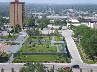 In 2008, construction began on the Joslyn Museum Sculpture Gardens, which would better utilize the space received in the 1987 land exchange.[4][6][14] The gardens opened in the summer of 2009, featuring work from local and national artists as well as a reflecting pool and waterfall.[15][4] Shortly after its opening, the garden hosted the 24th annual Jazz on the Green festival; it continued to host that event until 2010, when Omaha Performing Arts began producing it. It was then moved it to the Midtown Crossing at Turner Park.[16]